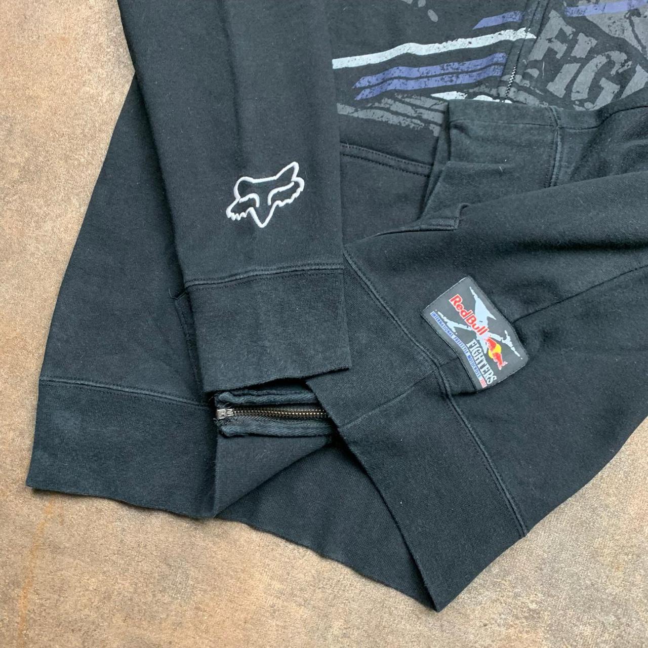 Crazy Fox x Red Bull hoodie with fox detailed hardware, a large red bull x fighters graphic on the front & a red bull branded tab on the lower left side, an embroidered foxhead logo on the sleeve, coloured black all over & in great second hand condition with minimal wear from age.